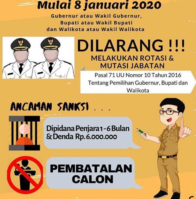 Adapun isi UU Nomor 10 Tahun 2016 Pasal 71 Ayat 2, berbunyi Gubernur atau Wakil Gubernur, Bupati atau Wakil Bupati, dan Walikota atau Wakil Walikota dilarang melakukan penggantian pejabat 6 (enam) bulan sebelum tanggal penetapan pasangan calon sampai dengan akhir masa jabatan kecuali mendapat persetujuan tertulis dari menteri.